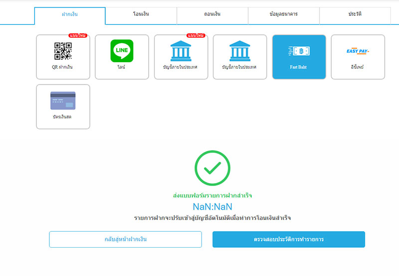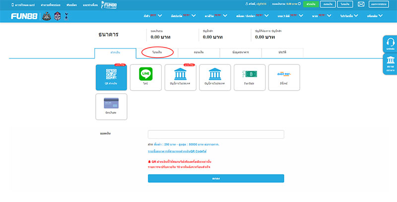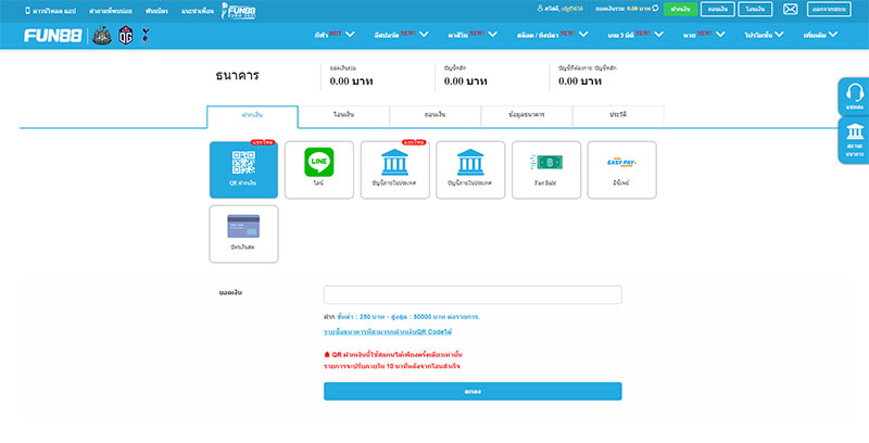 ขั้นตอนที่ 2 หลังจากที่ผู้เล่นป้อนชื่อ "จริง" ของคุณแล้ว ก็จะเข้าสู่หน้าธุรกรรมของ FUN88 โดยในหน้าธุรกรรมจะให้ผู้เล่นเลือกวิธีการใดก็ได้ในการฝากเงิน ซึ่งคุณมีหลายทางเลือก ได้แก่ การฝากด้วยคิวอาร์โค้ด, LINE, บัญชีในประเทศ (แบบฟอร์มใหม่/เก่า), Fast Baht, EASY PAY และบัตรเงินสด ซึ่งวิธีการทำธุรกรรมนี้ให้ผู้เล่นได้เลือก อีกทั้งด้านล่างเราจะอธิบายวิธีการทำธุรกรรมโดยยกตัวอย่างบัญชีในประเทศ Fast Baht และ EAZY PAY
