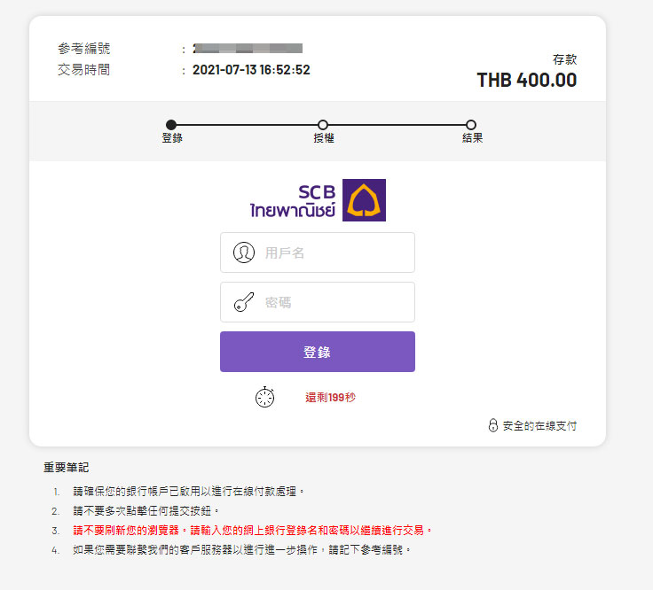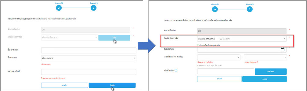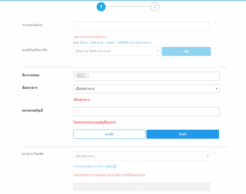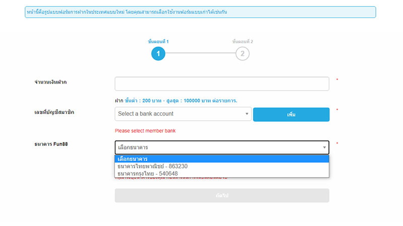 ขั้นตอนที่ 1 หากคุณเลือกบัญชีในประเทศคุณต้องกรอกจำนวนเงินฝากขั้นต่ำ 200 บาทและจำนวนเงินที่ทำธุรกรรมสูงสุดคือ 100,000 บาท ขั้นตอนต่อมา คุณต้องกรอกบัญชีธนาคารของคุณ และขั้นตอนสุดท้ายเลือกธนาคารที่ใช้ทำรายการ เลือกมา 2 ธนาคารที่ใช้กันปกติโดยทั่วไป หรือคุณสามารถเลือกธนาคารอื่นก็ได้เช่นกัน