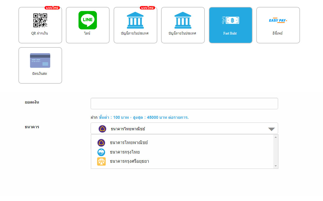 ขั้นตอนที่ 1 หากคุณเลือกใช้วิธีการเติมเงินแบบ Fast Baht วิธีการนี้ง่ายดายมาก คุณต้องกรอกยอดเติมเงินของคุณก่อน แล้วค่อยกรอกธนาคารที่คุณใช้ จากนั้นก็สามารถยืนยันและดำเนินการในขั้นตอนถัดไปได้