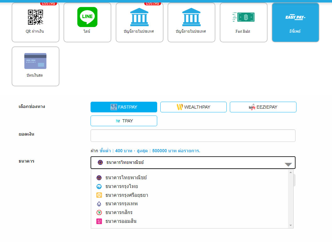 ขั้นตอนที่ 1 วิธีการทำธุรกรรม EASY PAY นั้นง่ายที่สุด เพียงแค่คุณเลือกซอฟต์แวร์ในการชำระเงินที่คุณต้องการใช้ และใส่จำนวนเงินที่คุณต้องการเติมเงิน ขั้นต่ำคือ 400 บาท และสุดท้ายเลือกธนาคารที่คุณต้องการ