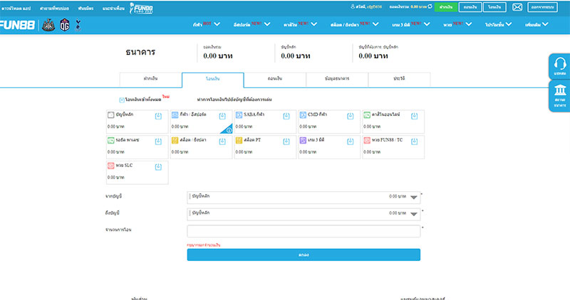 ขั้นตอนที่ 1 หลังจากสมาชิกทำการฝากเงินเรียบร้อยแล้ว ก่อนวางเดิมพัน คุณต้องโอนเงินจากบัญชีผู้ใช้ของคุณไปยังบัญชีเกม แล้วคลิกเลือกรายการโอนเงิน